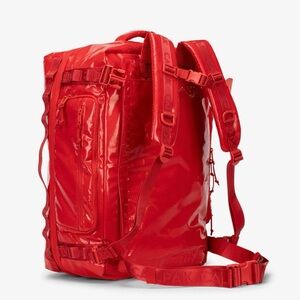 Bold red Calpak duffel bag. Ideal for travel. Sleek and functional design.