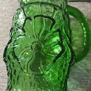 Elegant green glass pitcher featuring a detailed floral design. Perfect for serving beverages in style.