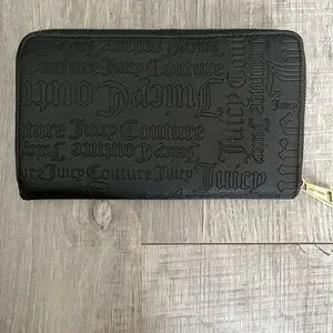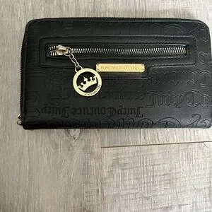 Elegant black wallet by Juicy Couture. Embossed design with gold zipper and charm.