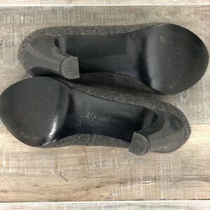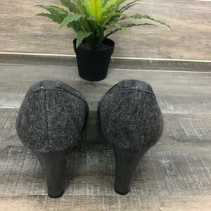 Jon Josef Gray Fabric Patent Leather Dress Heels. Fabric is like a felt with patton leather trimming. Beautiful shoes in great condition. See photos for heel height. Size 8.5