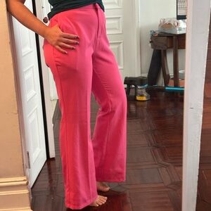 Chic wide leg pants in bright pink. Perfect blend of comfort and style. The high waist has been taken in, so even though the tag says size 10, it currently fits much smaller. The legs have been shortened by a few inches (they fit me and I am 5”1). All of the alterations are easily reversible.