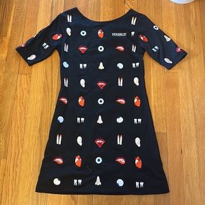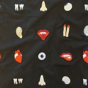 Unique and fun embroidered mini dress by verameat. It has embroidered body parts like eyes, hearts, and ears, throughout on a thick stretch black cotton. Labeled an xs, it can stretch to a s imo.