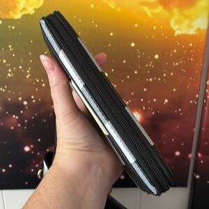 Long wallet features two large sections, 8 credit card slots and a center zip. Size of wallet is 4”H x 7.5”W x 0.5”D