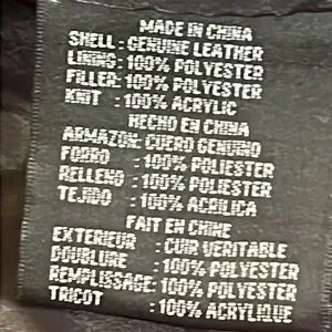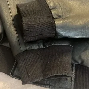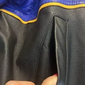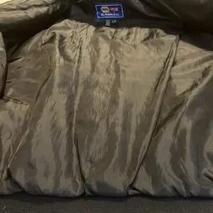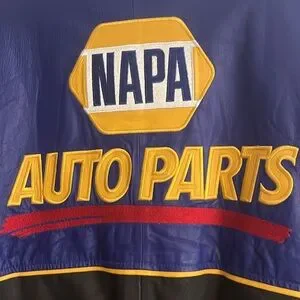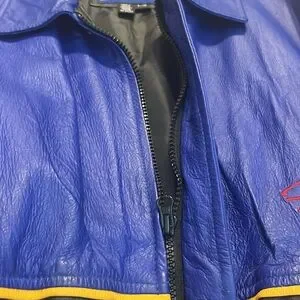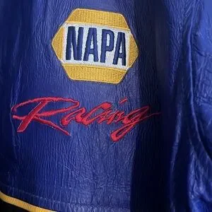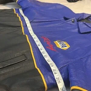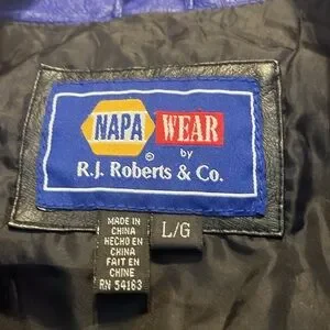 SOLD - Size large blue and black with yellow piping NAPA bomber style racing jacket by R. J. Roberts & Co. Features side pockets and both full zippered and snap front closure. Shell is 100% genuine leather and the lining and fill is 100% polyester. The knit ribbed sleeve cuffs and waistband are 100% acrylic. Apprx measurements are: underarm to underarm across laying flat 25-3/4" and shoulder to hem 26-3/4". This jacket sells on other online sites for well over $100. Great quality and condition with no holes, tears or stains and from a smoke and pet free. Bundle with any additional item(s) for an automatic 15% discount at checkout plus pay only one shipping fee! ๐