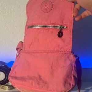 Stylish Kipling crossbody bag in vibrant pink. Features a front zip pocket and signature logo.