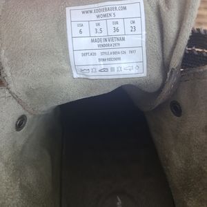 Eddie Bauer Evanesce boots with leather upper fine-knap finish, synthetic nubuck lining and high abrasion, non-marking rubber outsole, and removable inner footbed lining.