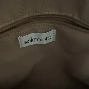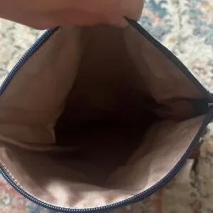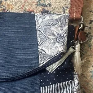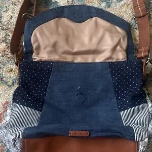 Stylish shoulder bag with floral and stripe patterns. Features navy, brown, and white colors. Perfect for everyday use.