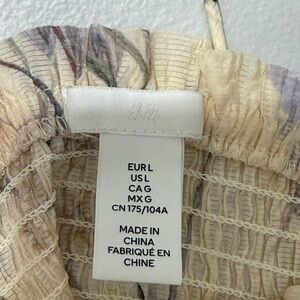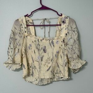 Chic cream blouse with floral design. Features smocked bodice and puff sleeves. Ideal for stylish outings.