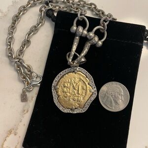 This vintage-inspired necklace features a stunning gold coin pendant encased in a detailed silver frame. A timeless piece that adds elegance to any ensemble.