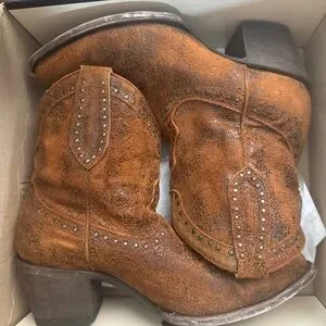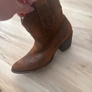 Cognac color bootie. Size 9. Only worn twice. They run small. Kept in box. Besides scuffing on sole no real wear.
