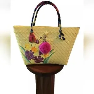 This stunning tote bag is a must-have for fashion-conscious women who love unique, handcrafted pieces. The bag boasts a beautiful gingham basket weave pattern and is adorned with hand-painted flowers. The silk-wrapped double handles in matching color with decorative fabric cover add a touch of sophistication to the bag's overall aesthetic.