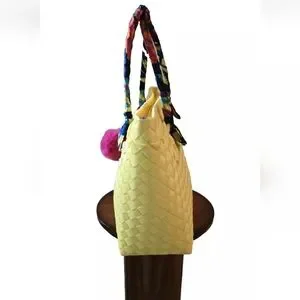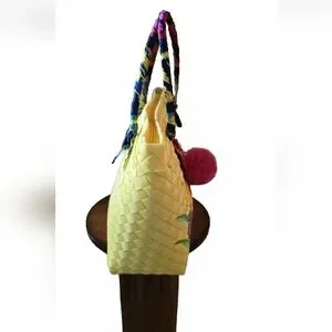 With a zip closure, the bag is perfect for travel, party/cocktail, casual, and workwear occasions. It's large enough to store all your essentials, with a size of 18" at the top and 14" at the bottom in width, 11" in height, and 5.5" in depth. This eco-friendly bag is handmade by artisans in the Philippines with PVC and fabric exterior material and comes with a bag charm. Indulge in designer style with this unique tote bag.