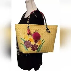 Gingham Basket Weave Handcrafted, Handpainted Silk-Wrapped Handle Tote Bag NWOT