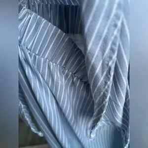 Features a soft blue-and-white vertical stripe pattern, a deep V-neckline with adjustable front tie, short flutter sleeves, and elastic waist for a comfortable yet flattering fit. The wide-leg silhouette with cropped length adds breezy movement, while the light lining ensures confidence and coverage.