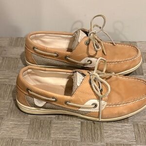 Classic Sperry loafers in tan leather. Features lace-up design and durable sole. item has been relived and wear is shown in photos. Laces are also worn and slightly frayed. Could use a cleaning but has a lot of life left!