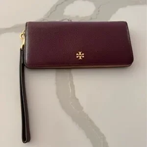 Chic wristlet by Tory Burch in deep purple. Features a gold emblem and sleek strap.