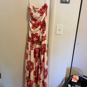Chic maxi dress with vibrant red floral design. Perfect for elegant occasions. Comfortable and stylish.