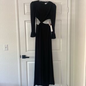 This elegant black evening dress features stylish cutouts and long sleeves, perfect for a sophisticated night out.