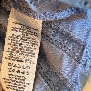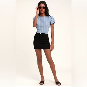 This Free People Starstruck top is a light blue cotton blouse with puff sleeves, eyelet detailing, and an open-back design. It has two ties—one at the top and one at the bottom—so you can adjust the fit.