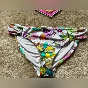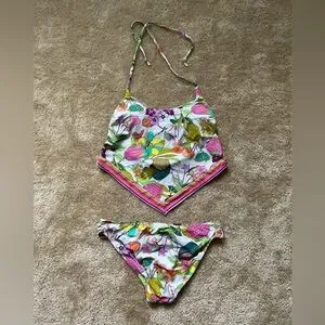Trina Turk “Key West” handkerchief bikini (size 8) was purchased from Boston Proper. Tags are removed but it has never been worn — only stored in a closet. The bright floral print is perfect for summer or vacation, with a flattering handkerchief-style halter top and matching bottoms.