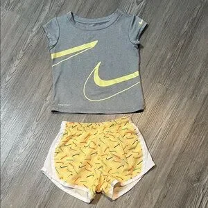 Nike set with a gray tee featuring yellow accents. Paired with vibrant yellow shorts. Nice condition. Super cute set. Size 2T.