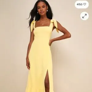 Brighten your day with this chic yellow midi dress from Lulu's. Features a stylish square neckline and elegant slit. Ideal for any occasion.