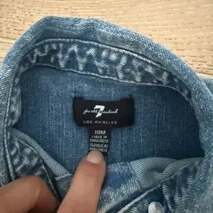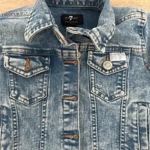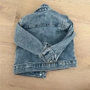 Trendy light blue jean jacket for kids. Features button closure and chest pockets. Ideal for layering. Gently worn