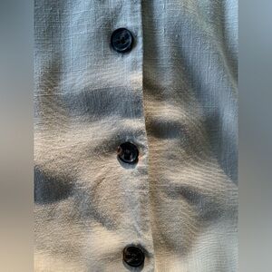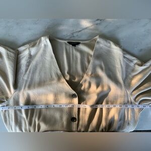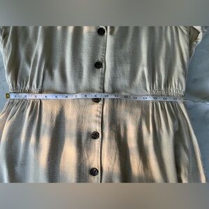 This XL Tall linen and rayon blend dress has a stretchy waist, V neck, flutter short sleeves, button down placket, smocked side and back waistband. Unlined.