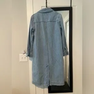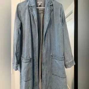 Stylish long denim duster. Features front pockets and open front design. Ideal for casual layering. Size Small, I’m usually between a small and medium fits perfect.