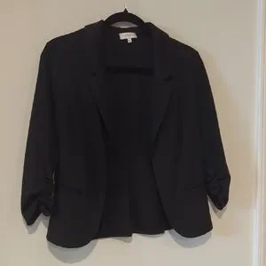 Sophisticated black blazer with stylish ruched sleeves. Ideal for professional and casual settings.