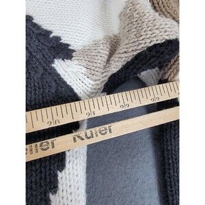 Classic oversized cardigan sweater featuring bold tan, cream, black, and white argyle pattern