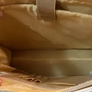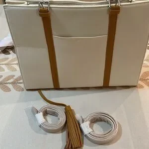 This is a brand new laptop tote. Beautiful cream and tan material. Measurements are 15” L x 5” W x 11.5” H.