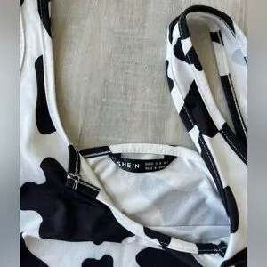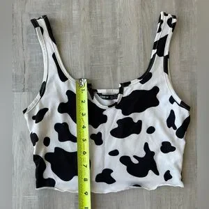 SHEIN White & Black Cow Print Crop Tank Top w/Lettuce Edge Scoop Notch Neck XS
