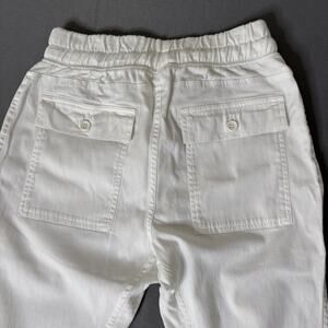 The James Perse sweatpants are crafted from lightweight, non-stretch twill. These joggers feature a knit waistband, inseam panel, and cuffed hem. They also feature a covered elastic waist with a drawstring and patch front pockets.