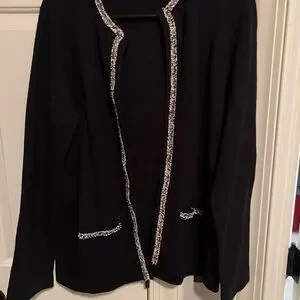 This sophisticated black jacket features a stylish silver trim, perfect for adding a touch of elegance to any outfit. Ideal for both casual and formal occasions.