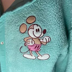 This aqua blue sherpa jacket has a front image of Mickey Mouse pointing his thumb toward his chest.