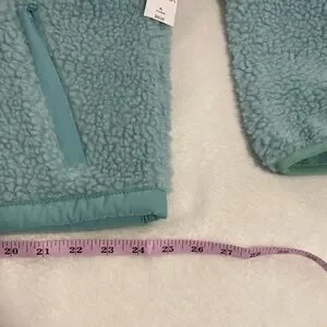 The inner lining is a fuzzy fleece. The front features a button closure. There are front left and right zipper pockets. The inside has additional pockets with no closures.
