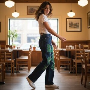Stylish blue jeans featuring a unique green floral patchwork design. Perfect for adding a touch of personality to your wardrobe.