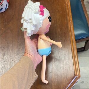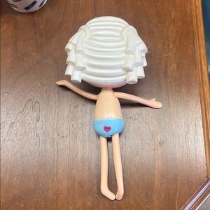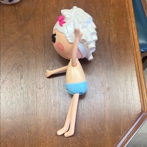 This charming doll features delightful pink bows and a cute blue outfit, perfect for imaginative play. A wonderful addition to any child's toy collection. She does have some marks
