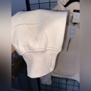 Cozy women’s half zip pullover sweater in a neutral cream color. Has a kangaroo pocket and thumb holes. Has an oversized fit and hits about the waist. Very soft and comfortable. NWT