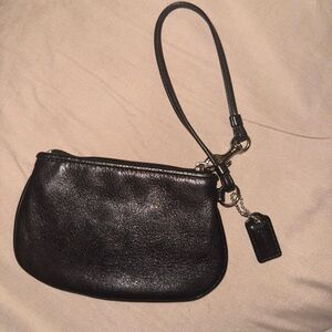 Classic Coach wristlet in smooth black leather with pleated front detail and silver-tone horse & carriage logo. Features a detachable wrist strap, zip-top closure, and rich purple fabric lining. Compact yet functional — perfect for carrying essentials like cards, cash, and keys.