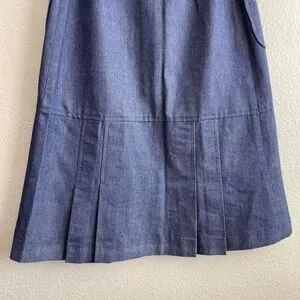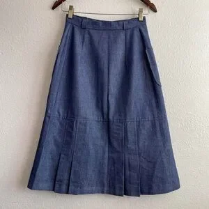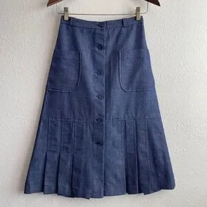 1970s selvedge blue denim pleated midi skirt with button-up front and pockets