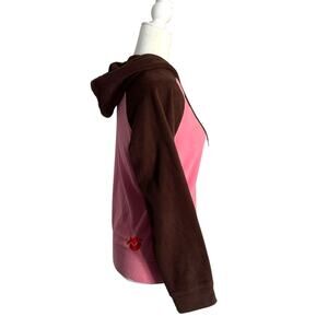 Baby pink and brown two-tone fleece hoodie with raglan sleeves! Happy Bunny embroidery on front with kiss marks on his booty, plus kiss mark embroidery on back hip!
