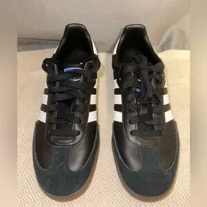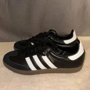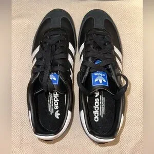 Classic Adidas Samba sneakers. Black and white design with gold accents. Tried on but never worn out.