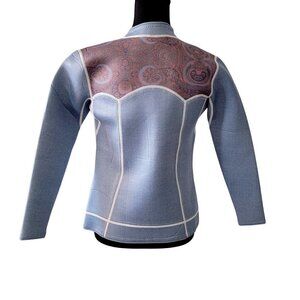 This wetsuit jacket worn for surfing provides a Combination 1.5mm printed vintage denim look neoprene rubber for ocean water sports.