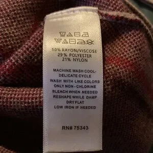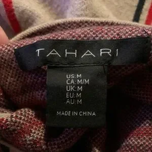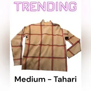 Elegant Tahari turtleneck sweater. Tan with striking red accents similar to a Burberry pattern. Perfect for any occasion. Super soft and warm, great for work or a fall outing