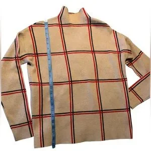Tahari Womens mock Turtleneck Sweater in Tan with Red Accents plaid