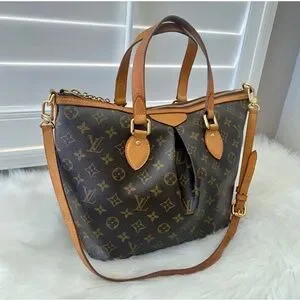 Authentic Louis Vuitton Palermo PM Bag in good used condition. The monogram canvas is clean and beautiful. The dark honey patina has normal signs of use and aging. There is one small ink mark on one of the handles (please refer to pictures and video). Handles and adjustable shoulder strap are strong and sturdy. Normal wear on bottom corners. No piping exposed. Inside has normal wear; makeup residue, ink marks, water stains. No holes, no rips, no odor. Zipper works good. Hardware has tarnished.