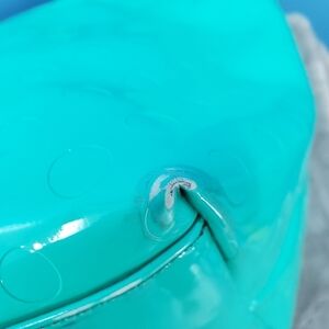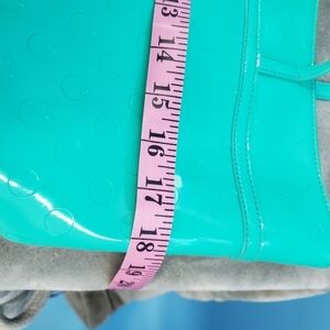 Kate Spade NY green tote, imprinted polka dot pattern, water resistant exterior and cloth interior, cute bow on front of bag, flaws are interior has some makeup stains and exterior has color transfer on bottom corners please see the photos, otherwise good used condition and very wearable, this is a brighter green than the photos which make it look more teal best color representation is first photo, measurements are listed in photos 18" across 11" tall and 20" total handle length, price reflects condition