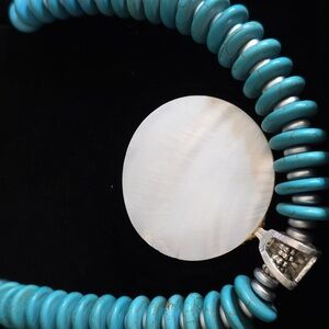 This stunning turquoise and gold necklace features a floral pendant design. Perfect for adding a touch of elegance to any outfit.